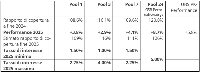 Nonostante le sfide, anche il 2025 è stato un buon anno di investimenti. La tabella seguente mostra l'andamento dei pool aperti e il grado di copertura stimato alla fine di dicembre 2025.